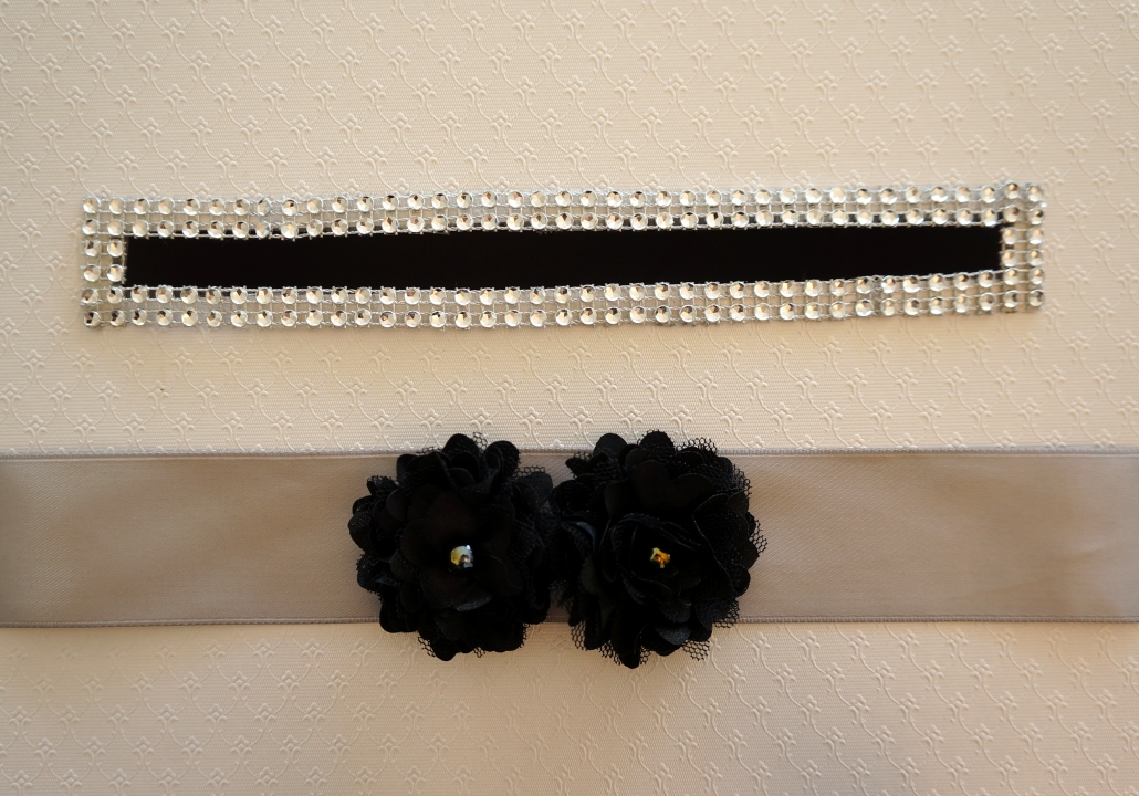 You can buy rolls of rhinestone ribbon which can easily be cut with scissors to what ever shape or size you need. Rhinestone ribbon looks gorgeous and can make your wedding card box look extra glamorous and expensive. It looks great around the edge of the card slot.